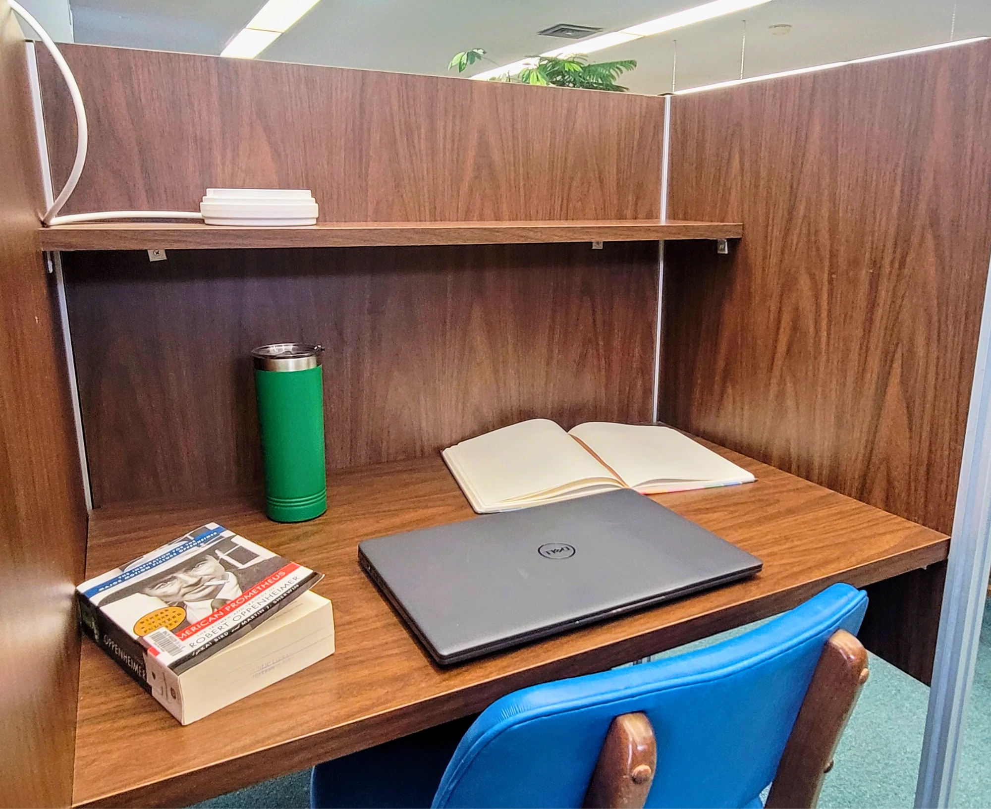Four partitioned study carrels with charging stations are available for use during normal library hours of operation. The library offers exam proctoring and several free digital resources for people looking for study and career materials.