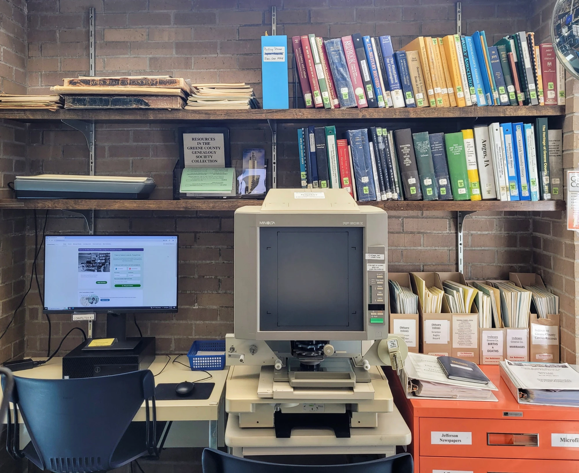 The library enjoys a unique partnership with the Greene County Genealogical Society: their reference collection is housed in the library basement. Volunteers assist patrons during open hours.