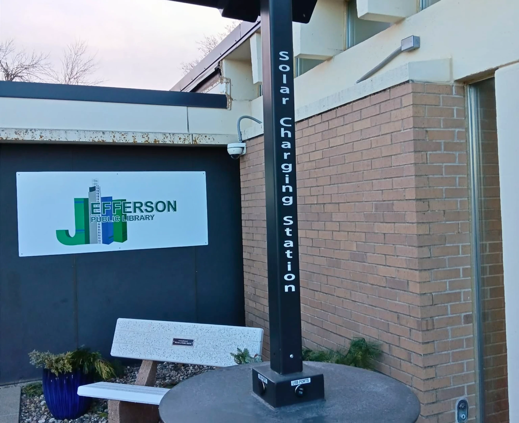 Looking to enjoy the weather and still use your devices? The Jefferson Public Library has an outdoor Wi-Fi area, complete with a charging station area that runs on solar energy. Relax at our picnic table - courtesy of the Friends of the Library - or sit on our Wayne and Isabel Smith memorial bench while you use the Internet!